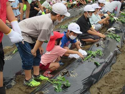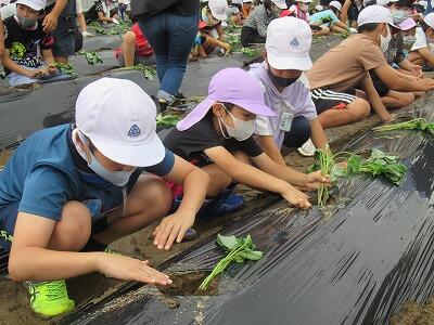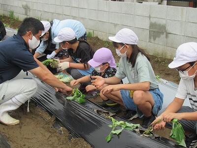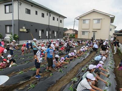 昨日の雨で一日延期しての実施となりましたが、甲斐さんやJAの皆さんに教えていただきながら1本1本丁寧に植えることができました。各学級800本、全体で2400本もの苗を植えさせていただきました。貴重な体験となりました。
