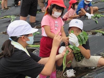 畑を貸していただいている甲斐俊行さんのご指導のもと、幼稚園生に優しく教えながら芋を植えることができました。約350本の苗を植えました。