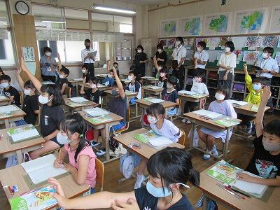 初めて英語を学ぶ3年生は、とても楽しそうに発音したりゲームに挑戦したりしています。
