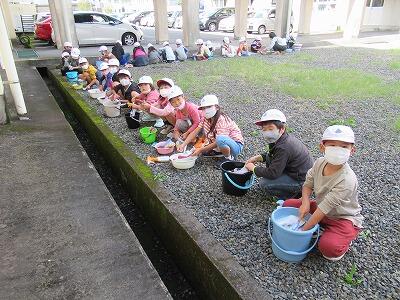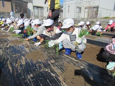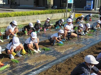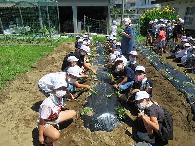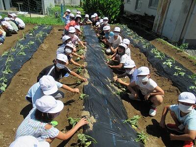 5年生が西階幼稚園生と一緒に芋植えをしました。畑は学校のすぐ近くにあります。