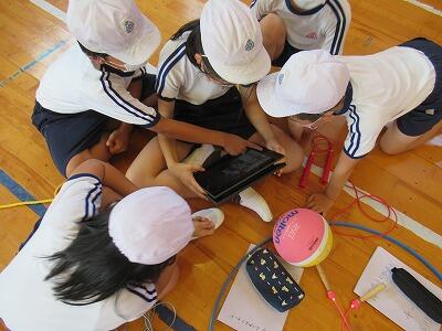 体育館の横では、3年生が理科の実験をしていました。鏡を使って日光を反射させ、壁に置いた温度計の温度を上げる実験です。とても楽しそうでした。