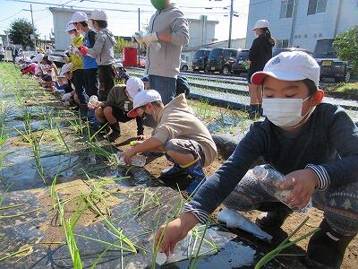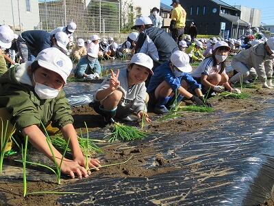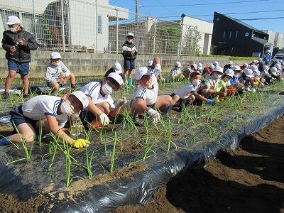 3年生が玉ねぎの苗を植えました。総合的な学習の時間の一環です。