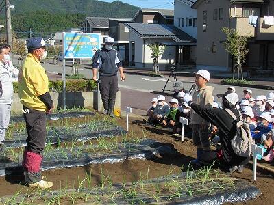 南方小学校では、平成13年から学校のすぐ西側にある甲斐俊行さんの畑をお借りして玉ねぎ栽培の体験活動を行っています。今年は看板を設置しました(最後の写真です)。今年も甲斐さんに土作りから畝づくりやマルチはりなどをしていただきました。