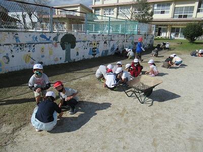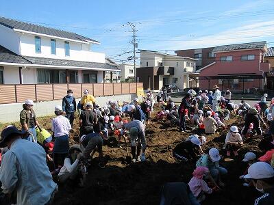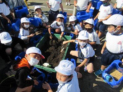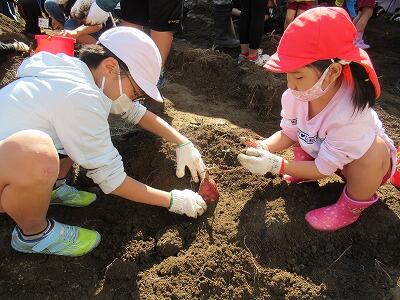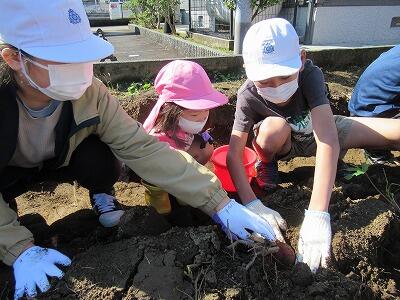 芋掘り(2年生)とチューリップの球根植え(1年生)