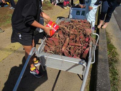 掘り始めると、大小様々なサツマイモが顔を出しました。子どもたちは大喜びでした。掘り出した芋は、給食で味わうとともに、子どもたちも一部持ち帰るそうです。