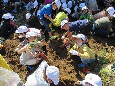 土の中からは大きく育った芋が次々に顔を出し、喜びの笑顔が畑いっぱいに広がりました。5年生が幼稚園生に優しく接する場面がたくさん見られ、とても意義のある活動であると感じました。(甲斐俊行さんのお世話で15年間続いている活動です。)