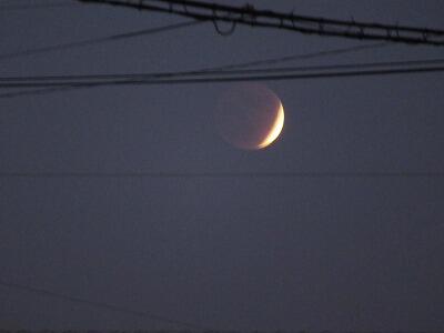 月食は、太陽と地球、月が一直線に並ぶことで起きます。今回は、月が全て隠れる皆既日食に近い部分日食でした。写真は午後5時50分頃です。
