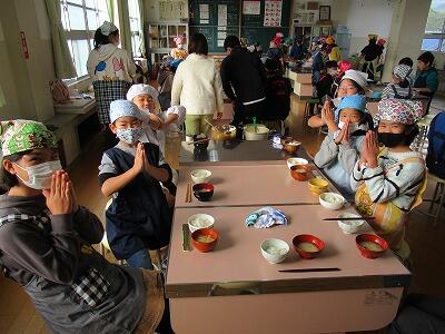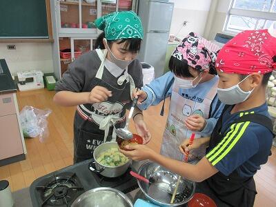 担任と栄養教諭の指導を受けながら、ごはんを炊いたり味噌汁を作ったりしました。5年生として初めての調理実習でしたが、班の友達と力を合わせて作業を進めました。