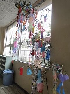 4つの学級それぞれで七夕かざりを作って、廊下に飾っています。