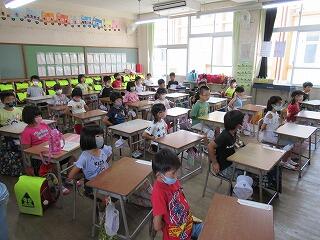 新型コロナウイルス感染防止のため、玄関で検温や手指の消毒を行いました。本年度初めての読み聞かせについても、「子どもたちは自分の席で」「読み聞かせはマスクをしたまま」行いました。子どもたちは、読んでいただく本をくいいるように見つめ、本の世界に飛び込んでいました。