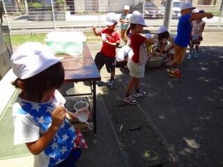 また、水でっぽうあそびでは、水着に着替えて思う存分、水をかけ合いました。担任も、童心に返って一緒に楽しみました。ひとときの涼をみんなで味わいました。