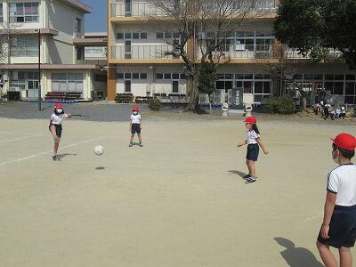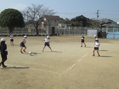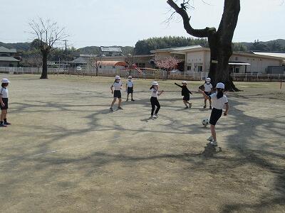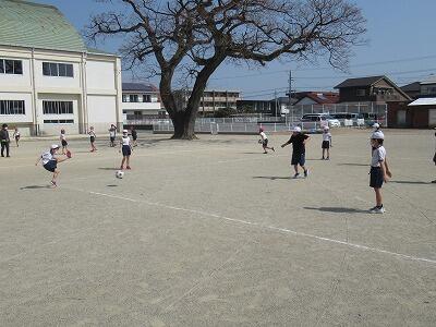 青空の下、2年生がサッカーの練習をしていました。鳥かごというルールで元気にボールを蹴り合っていました。