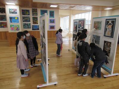 昨年度は、その代替措置として、学級代表となった子どもたちの作品を多目的ホールに展示し、校内作品展を開きました。保護者の皆様には2月の参観日に見ていただき好評を博しました。