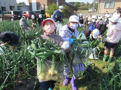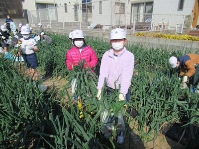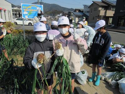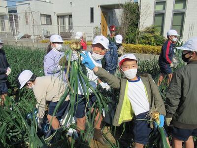 子どもたちは収穫をとても楽しみにしており、畑のあちこちから歓声が上がりました。大きな玉ねぎを手に大満足の様子でした。子どもたちは5個ずつ家庭に持ち帰り、きっとおいしくいただいたことでしょう。また、学校給食用にもたくさんの玉ねぎをいただき、18日に全校児童・職員で味わわせていただきます。
