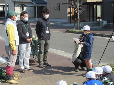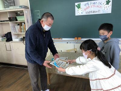 植え付けから収穫までお世話になった甲斐俊行さんをお迎えし、一緒に給食を食べていただきました。また、子どもたちからの感謝の手紙をお渡ししました。
