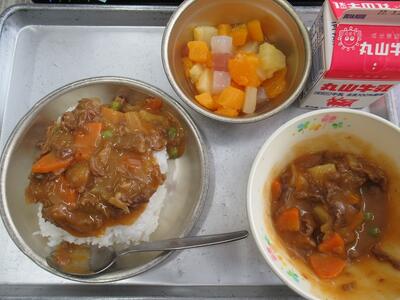 昨日の給食は宮崎牛のカレーとフルーツポンチでした。やわらかい宮崎牛がとてもおいしかったです。(本校と上南方小学校の6年生のリクエスト給食とのことでした。)