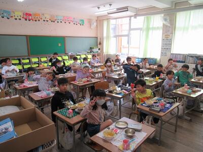 写真は1年生の給食の様子です。コロナ禍なので黙食ですが、子どもたちの表情においしさが表れていました。
