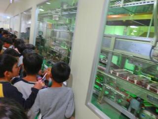 さっき見た魚市場から運ばれた新鮮な魚が原料であると知って、びっくり!練ったり、まぜたり、味付けしたり…様々な工程をへてかまぼこやちくわ、あげみなどができる様子をビデオで紹介していただきました。その後工場見学をさせていただき、たくさんのちくわがくるくる回りながら焼かれている様子に目はくぎ付けでした。地元の食材を使った地元の食べ物、おいしくいただきたいですね。