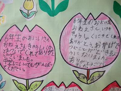1~5年生の子どもたちが、卒業する6年生への感謝やお祝いのメッセージを書きました。現在、児童玄関に展示しています。いろいろなお世話をしてくれたことや、いろいろな場面での6年生の活躍などが丁寧に書かれています。
