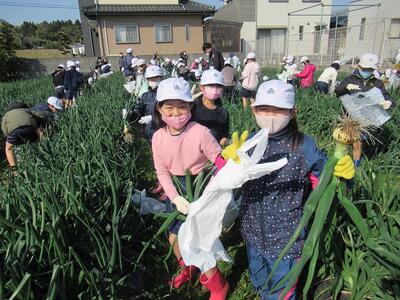 子どもたちは収穫をとても楽しみにしており、畑のあちこちから歓声が上がりました。大きな玉ねぎを手に大満足の様子でした。子どもたちは5個ずつ家庭に持ち帰り、きっとおいしくいただいたことでしょう。また、学校給食用にもたくさんの玉ねぎをいただき、18日に全校児童・職員で味わわせていただきます。