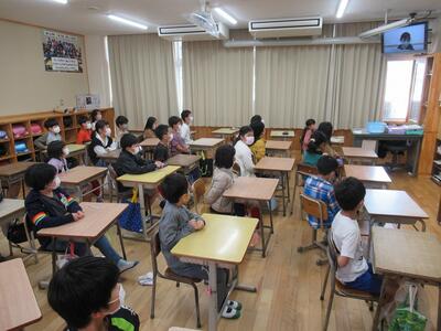 学校にいるときに、いつ避難する事態が起こるか分かりません。地震・津波に備えて、訓練を行います。本校は幼稚園と隣接するため協力して垂直避難します。幼稚園生と6年生が顔合わせを行いました。