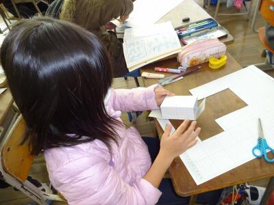 算数では、「直方体と立方体」の学習をしています。先日、工作用紙を使って直方体を作りました。展開図をかいたあと、組み立てて、直方体を作り、どの辺とどの辺が重なるのか、どの頂点とどの頂点が重なるのかを調べました。工作用紙を使って直方体を作る活動は、みんな集中して行うことができました。