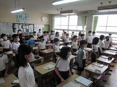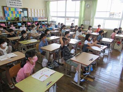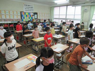 2校時に行った終業式(校内TV放送)では、児童代表の3年生が1学期を振り返って作文を読みました。算数や理科をがんばったことを詳しく発表してくれました。校長先生からは、本年度の目標である「自立と貢献」についての話がありました。なかなか歌う機会のない校歌も歌いました。