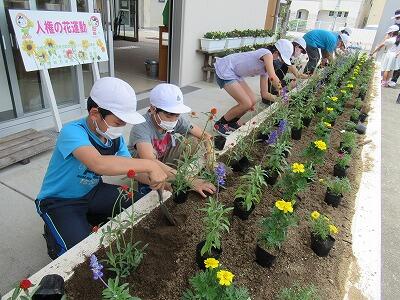 梅雨の晴れ間となった今日、環境委員会の子どもたちが人権の花運動で贈られた花の苗を花壇に植えました。マリーゴールドや千日紅など、美しい花の数々です。これから、子どもたちが中心となってお世話をしていきます。(管理等東側と正門近くの花壇を使って花を育てていきます。)