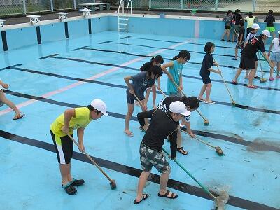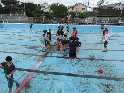 午前と午後に分け、プールの底にたまった泥を取り除いたり、壁や底を磨いたりして見違えるようにきれいになりました。