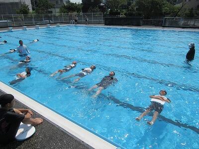 写真は5校時に行った6年2組の様子です。これ以上ないような絶好のプール日和の中、子どもたちが元気に活動していました。授業の後半では、おぼれたときなどの対処(力を抜いて浮くこと)を練習していました。