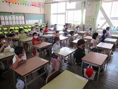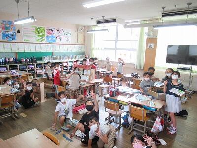 始業式は校内テレビ放送で行いました。6年生の作文発表、校長先生のお話、2学期の学習や生活についての話、コロナウイルス感染防止対策の話を行いました。