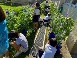 咲いた花で色水を作ったり、花や葉っぱの擦りだしをしたりして楽しみました。