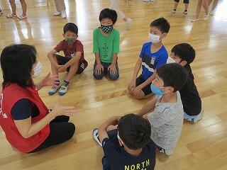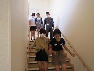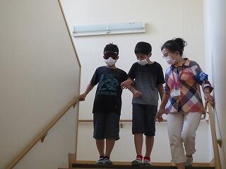 2人ずつのペアになり、ボランティア協会の皆さんのアドバイスを得ながら階段や廊下を歩きました。体験した子どもたちは、「前後左右が見えないのが怖い」「足がふるえた」「目の前に壁がありそうで怖かった」などの感想を話してくれました。ガイド役の子どもたちも、「友達が転んでケガをしないか心配だった」と責任の大きさを感じているようでした。