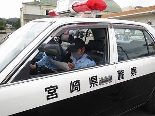 本校に在籍する2名が中心となり、パトカーのスピーカーを使って交通安全の呼びかけをしました。横断歩道で左右をよく見ることや飛び出しをしないことを、登校する子どもたちに呼びかけました。