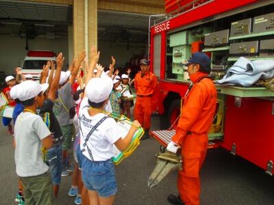春の遠足で社会科の学習をかねて消防署を見学しました。消防署ってどんなところだろう。消防車を見てみたいな。消防士さんのお話を聞いてみたいな。社会科の「火事からくらしを守る」の学習を通して、子ども達の興味・関心はとても高まっていました。実際に見学をさせていただいて学習がさらに深まりました。いろんな役割の消防車があること、その特徴や装備、通信指令室の様子、消防士さんは交代で24時間勤務していること、日頃から訓練をしていること・・・。わたしたちのくらしを守るために、いろんな工夫や努力があることがよく分かりました。