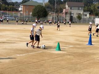3人でパスでつないで、最後はコーンに向かってシュート!