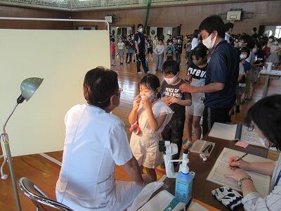 昨年同様、手指の消毒や自分でまぶたを下げるなどの感染対策を行った上で実施しました。子どもたちは緊張した様子でしたが、校医さんに進んで会釈をするなど素晴らしい態度で診てもらうことができました。