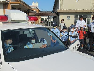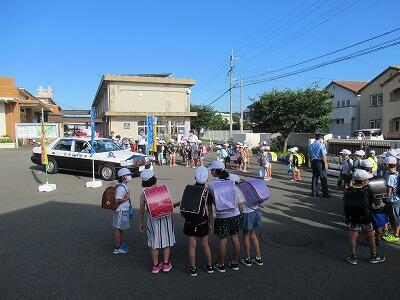 警察署や市役所の方々の協力のもと、パトカーのマイクを使って交通安全をアピールしました。初めは緊張した様子でしたが、回数を重ねるうちに声が大きくなり、夏の全国交通安全運動についてはきはきと話すことができました。登校してきた子どもたちは、興味津々でパトカーの周囲に集まっていました。