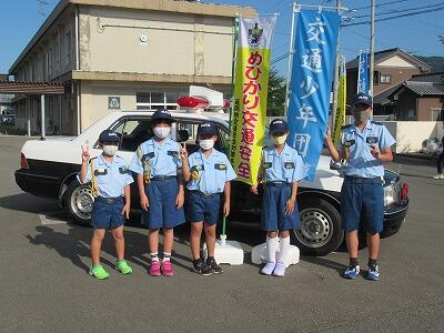 今朝、延岡市交通少年団のPR活動がありました。本校からは3~6年生の5名が交通少年団に所属しています。