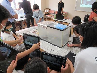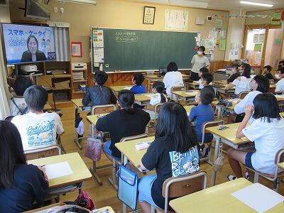 各教室と福岡(博多)のスタジオをオンラインで結び、スマートフォンやインターネットを使う上で注意することなどを学びました。