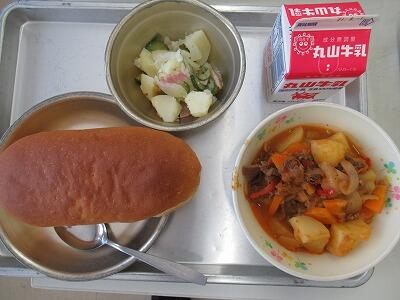 延岡市はドイツのホストタウンとなっており、今日はドイツ風の料理が給食のメニューでした。「グーラッシュ」というシチューと「カルトッフェルザラート」というポテトサラダです。どちらの料理も異国情緒あふれる味わい深いものでした。子どもたちもは、とてもおいしそうに食べていました。