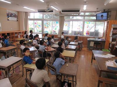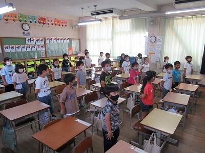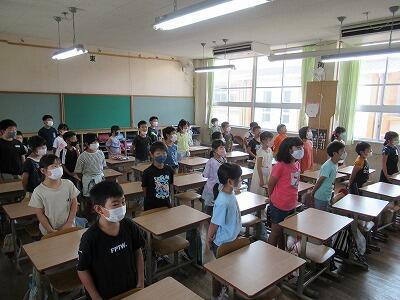 2校時に行った終業式(校内TV放送)では、児童代表の3年生が1学期を振り返って作文を読みました。算数や理科をがんばったことを詳しく発表してくれました。校長先生からは、本年度の目標である「自立と貢献」についての話がありました。なかなか歌う機会のない校歌も歌いました。