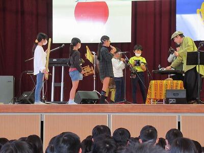 子どもたちは、様々な楽器の音色に驚いたりメロディーの美しさに感動したりしていました。途中、世界のいろいろな楽器を体験させていただく場面もあり、子どもたちは大喜びでした。