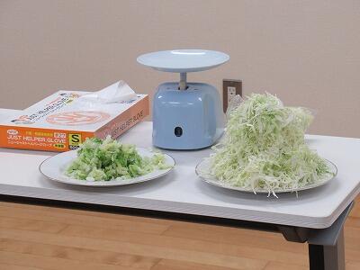 各家庭から持参した味噌汁の塩分を測ったり(2枚目の写真)、1日に必要とされる野菜の量を確かめたりするができました。3枚目の写真は、1日に必要とされる350gのキャベツです。右が生のもの、左が茹でたものです。茹でたものなら1日で食べることができそうです。