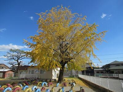 運動場にあるイチョウが美しく色づいています。