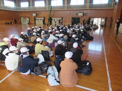 体育館で出発式を行った後、3台のバスに乗って出発しました。どの子の顔もにこにこしていて、2日間への期待があふれていました。