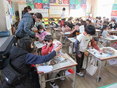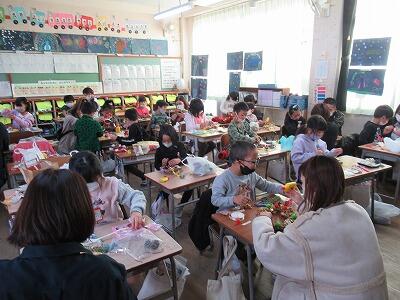 1年生は図工で飾り(あさがおのリース)作りをしました。保護者の皆さんに手伝ってもらうほほえましい場面も見られました。