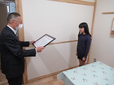 法務局や延岡市人権推進課から5名の方においでいただき、感謝状を贈呈していただきました。花を大切に育てたことに対する感謝状です。本校からは環境委員会の6年生3名が参加しました。(来ていただいた皆さんに、今年とれた花の種を差し上げました。)