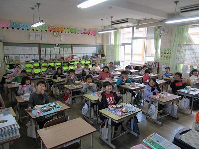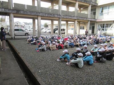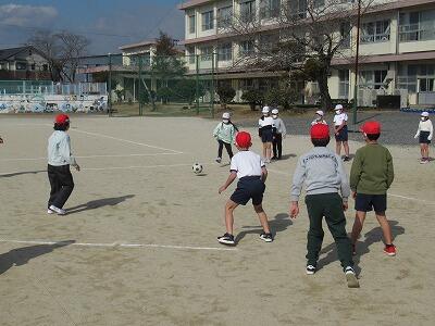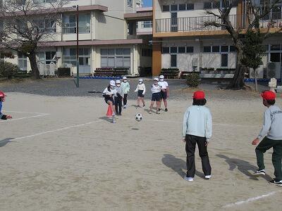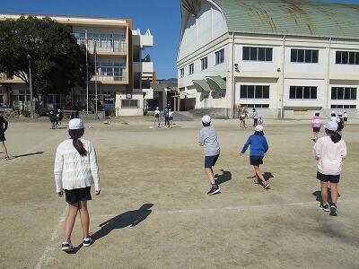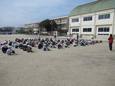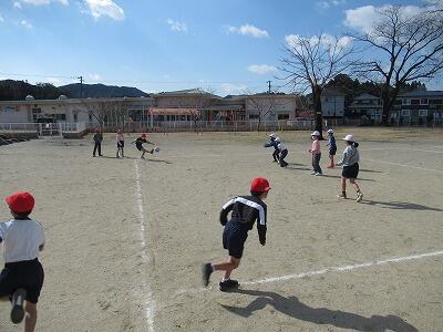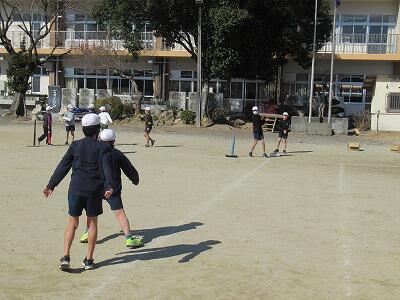 3時間目、3年生がキックベースボールをしていました。キックしたボールを捕球し守備側全員が集合して座ったらアウトというルールで楽しく試合をしていました。寒さに負けずにがんばる子どもたちの笑顔に元気をもらいました。