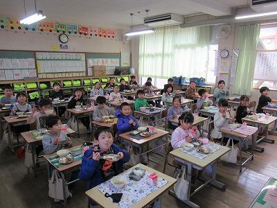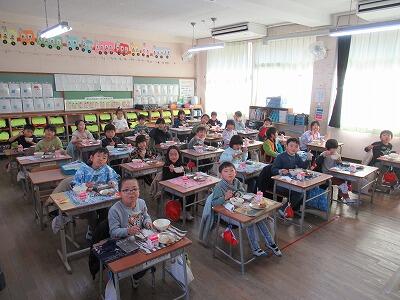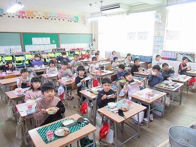 写真は1年生の給食の様子です。コロナ禍なので黙食ですが、子どもたちの表情においしさが表れていました。